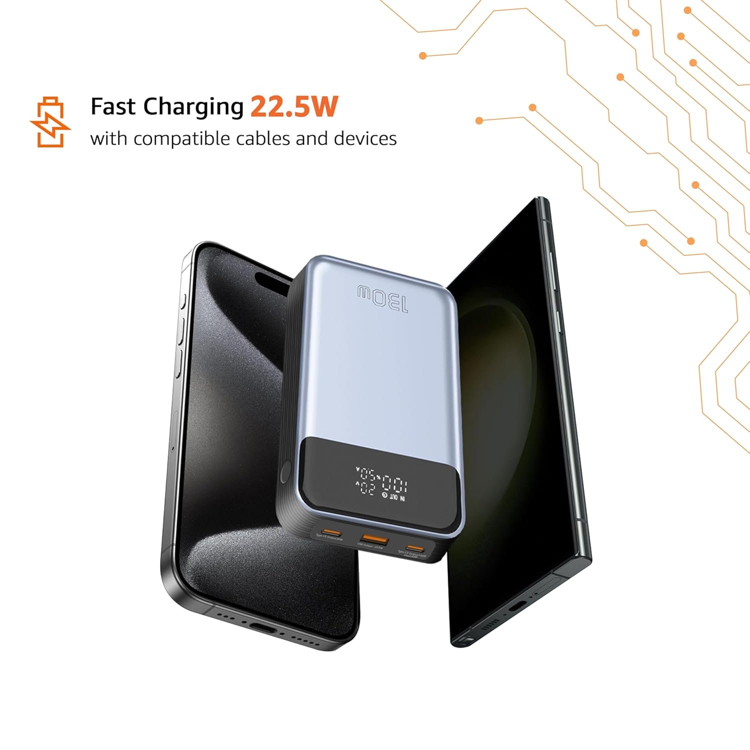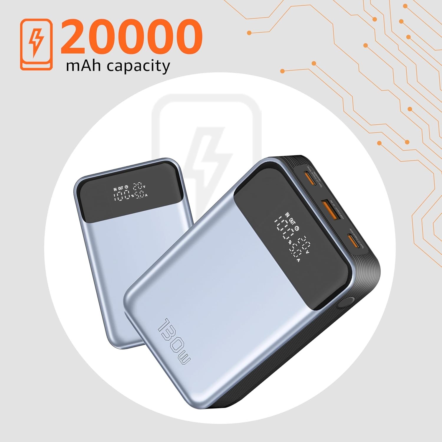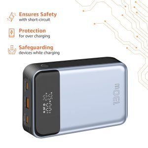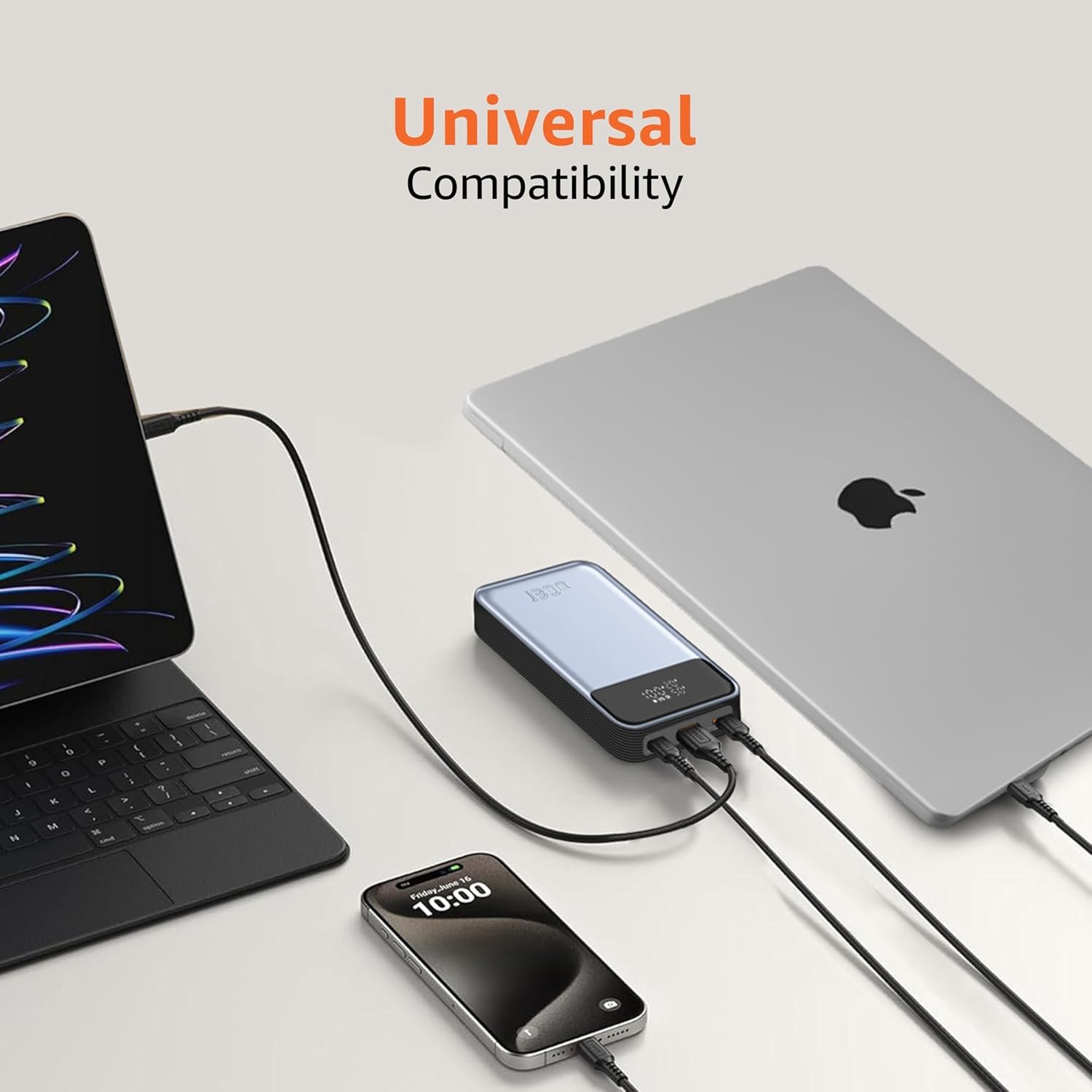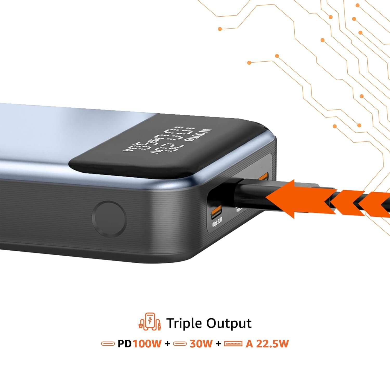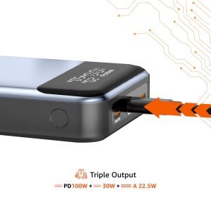 Experience ultimate power and versatility with this 20000mAh power bank. Its triple output with type C provides PD100W + 30W and USB A 22.5W fast charging for lightning-fast power-ups. The LED display shows the exact remaining power percentage for real-time tracking. Broad compatibility makes it suitable for mobile phones, tablets, laptops, AirPods, Bluetooth headphones, and smartwatches. In-built device protection ensures safety with short-circuit, overload, and over-charge protection. Enjoy rapid 22.5W charging and extended power on the go with 20000mAh capacity.