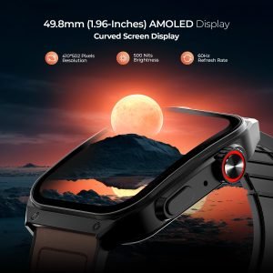 | Special Features | Accelerometer, Activity Tracker, Alarm Clock, Calorie Tracker, Camera, Notifications, Pedometer, Phone Call, Sedentary Reminder, Sleep Monitor, Text message, Time Display, Spo2 (Blood Oxygen Monitoring), Heart Rate Tracking, Bluetooth Calling, IP68 Smartwatch, 1.96″ AMOLED Display, 410*502 Pixel High Resolution, Built In Mic & Speaker, Voice Assistant, Find Phone, Daily Workout Memory, Distance Tracker, Multisport Tracker, Music Player |