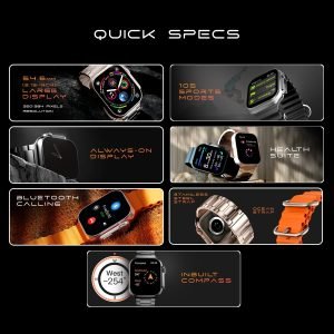| Special Features | Accelerometer, Activity Tracker, Alarm Clock, Calorie Tracker, Camera, Notifications, Pedometer, Phone Call, Sedentary Reminder, Sleep Monitor, Text message, Time Display, Spo2 (Blood Oxygen Monitoring), Heart Rate Tracking, Bluetooth Calling, IP68 Smartwatch, 2.02″ Display, 320*385 Pixel High Resolution, Built In Mic & Speaker, Voice Assistant, Games, Find Phone, Daily Workout Memory, Distance Tracker, Multisport Tracker, Music Player |