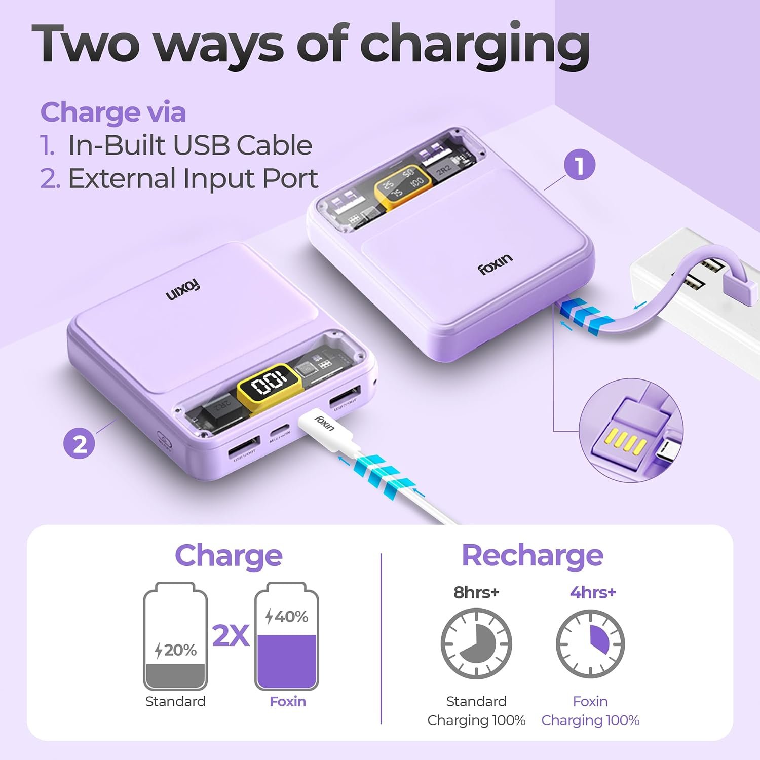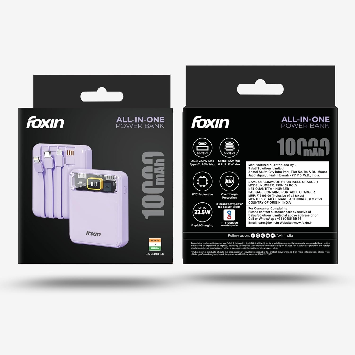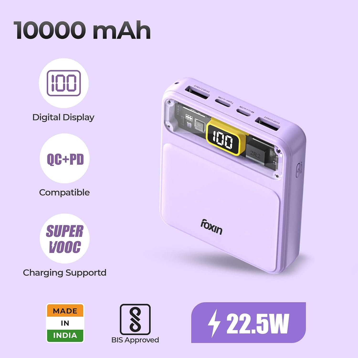 Foxin All-in-One 22.5W QC+PD Power Bank with Built-in Charging Cables 10000 mAh, BIS Certified, Purple