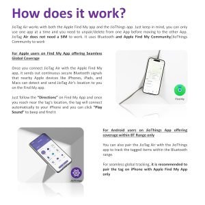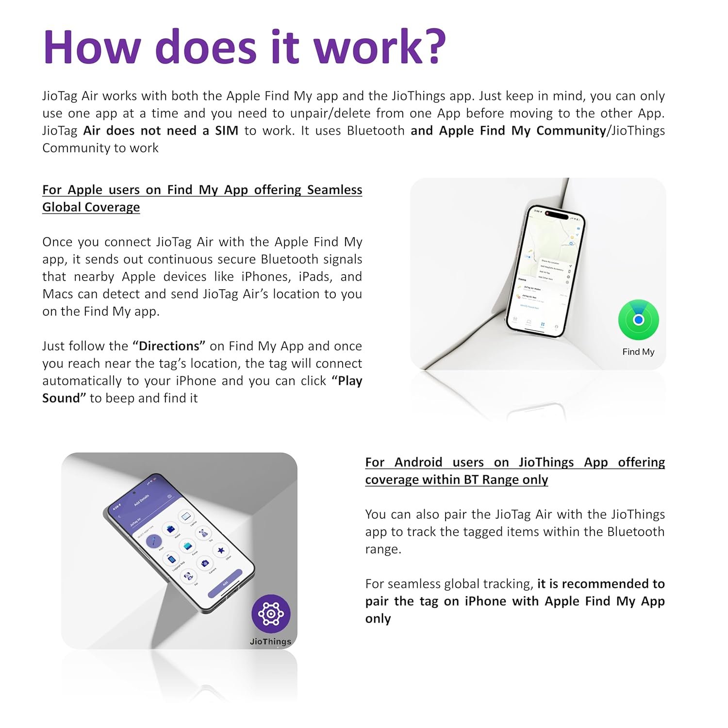 | Whats in the box | JioTag Air, Extra Battery, Double Sided Tape, Warranty Details and User Manual |