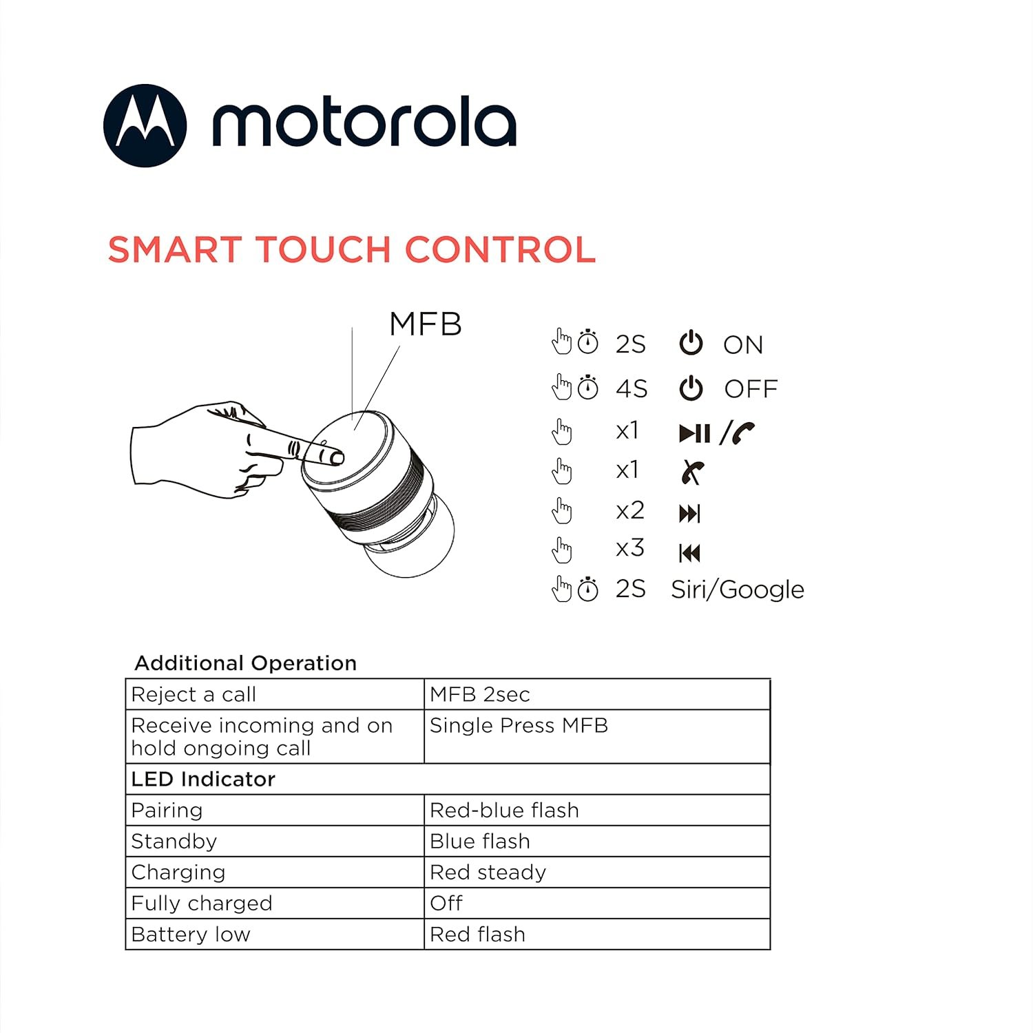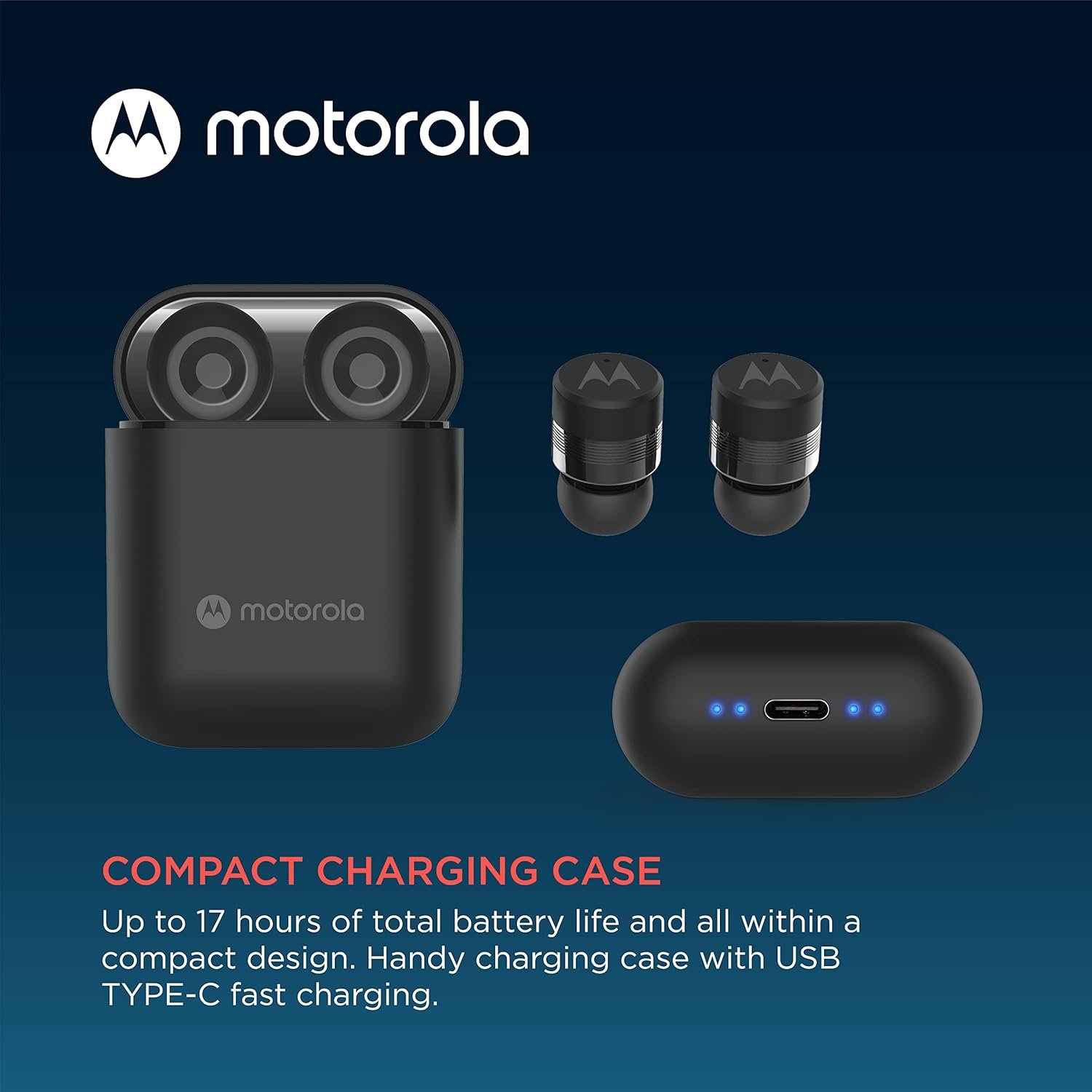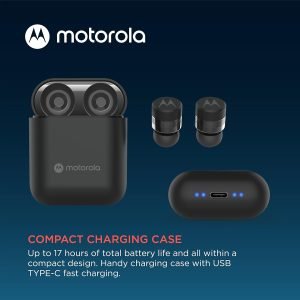 Motorola wireless earbuds combine superior sound with longlasting battery life in an ergonomic, compact design. These affordable water resistant ear buds with totally 17 hours of playtime offer handsfree calls and touch controls. Wireless earbuds for phone calls feature a built-in microphone in each ear bud for use together as pair, or as mono headset. Smart touch-control for calls and voice command are ideal travel accessories for work or school. Designed for everyday use, these Bluetooth earphones help resist sweat, moisture, and the elements to ensure a crystal clear sound experience for travel and optimal comfort. These ear buds make a great gift for everyone. Included is a sleek micro case that can be charged with the provided USB-C cable. These Bluetooth ear buds are designed as comfortable earbuds with optimal fit and compact for easy storage. Life is better with great sound. That’s why Motorola Sound designs products for the way you really hear. We carry true in-ear headphones, true wireless earbuds, over-ear headbands, and more.