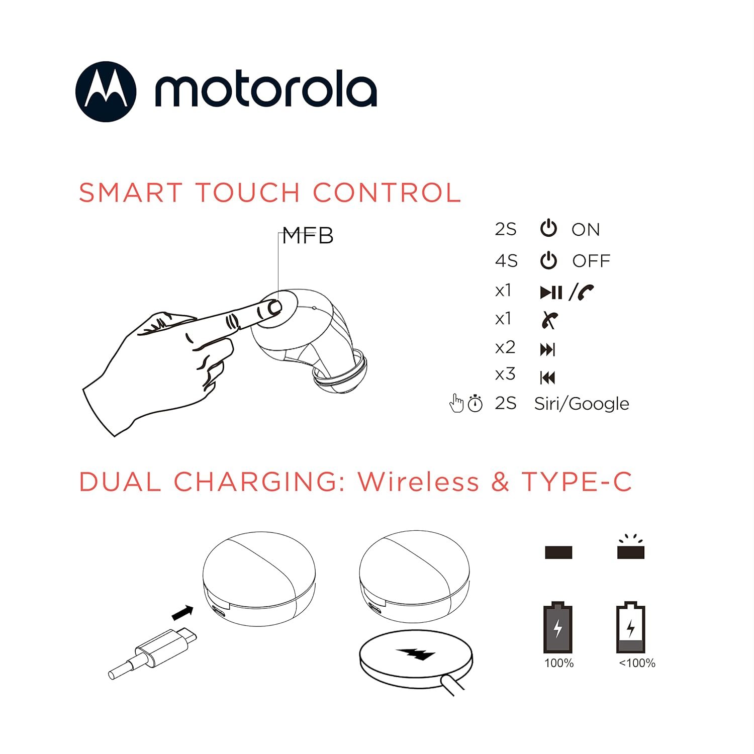 Motorola wireless earbuds combine superior sound with long-lasting battery life in an ergonomic, compact design. These affordable, waterproof earplugs with a total of 18 hours of playtime provide hands-free calls and wireless charging. Wireless earbuds for phone calls feature a built-in microphone in each earbud to use together as a pair or as a mono headset. Intelligent touch control for calls, volume, skip and voice command are ideal travel accessories for work or school. Designed for everyday use, these Bluetooth headphones help resist sweat, moisture and the elements to ensure a crystal clear sound experience for travel and optimal comfort. These earplugs are a great gift for everyone. Included is a slim micro case that can be charged wirelessly with a charging pad (not included) or with the included USB cable. These Bluetooth earbuds are designed as comfortable earbuds with optimal fit and compact for easy storage. Life is better with great sound. That’s why Motorola Sound designs products for the way you really hear. We carry real in-ear headphones, real wireless earbuds, over-ear headbands and more.