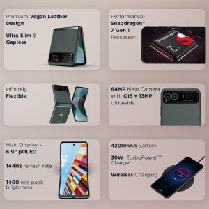 | Special features | Main Camera – 64MP (f/1.7, 0.7μm or 16MP 1.4μm Quad Pixel) | OIS | Laser Autofocus + Ambient Light Sensor, Camera 2 – 13MP (f/2.2, 1.12μm) | Ultra wide/ macro | FOV 120°, Single LED flash, Display – Main display: 6.9″” FHD+ pOLED display External display: 1.5″” OLED display, Body – Corning® Gorilla® Glass Victus® (external display cover) 7000 series aluminum (frame) Vegan leather (finishing), Battery 4200mAh non-removable, Front Camera 32MP selfie camera 32MP (f/2.4, 0.7μm or 1.4μm@8MP Quad Pixel) | Fixed focus | Display flash External display Main 64MP (f/1.7, 1/2″”, 0.7 or 1.4μm@16MP Quad Pixel) | AF | OIS | Laser Autofocus + Ambient Light Sensor Wide 13MP (f/2.2, 1/3″”, 1.12μm) | AF | Ultra wide | FOV 120°, Snapdragon 7 Gen 1 Mobile Platform, Memory 8GB LPDDR4X, Storage 256GB built-in UFS 2.2, Display Resolution – Main display: FHD+ (2640 x 1080) | 413ppi External display: 194 x 368 | 282ppi |