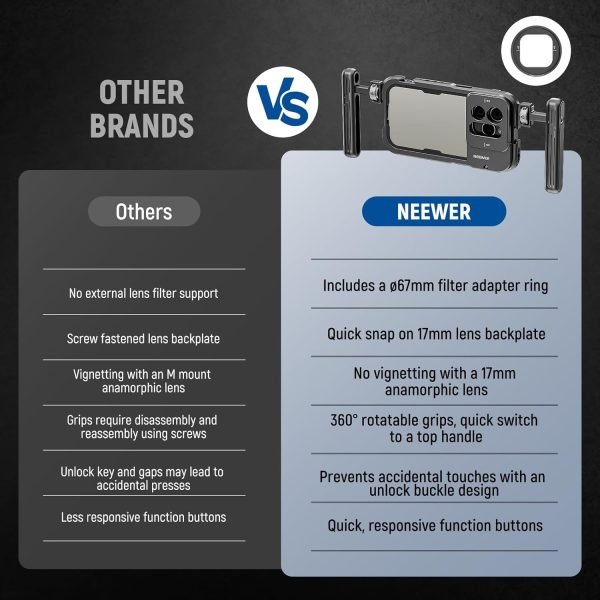 Only compatible with iPhone 15 Pro, this aluminum alloy phone cage with a soft rubber cushion provides reliable protection while keeping it slim. The hollow back is compatible with MagSafe wireless charging and NEEWER PA010 Magnetic Phone Holder.