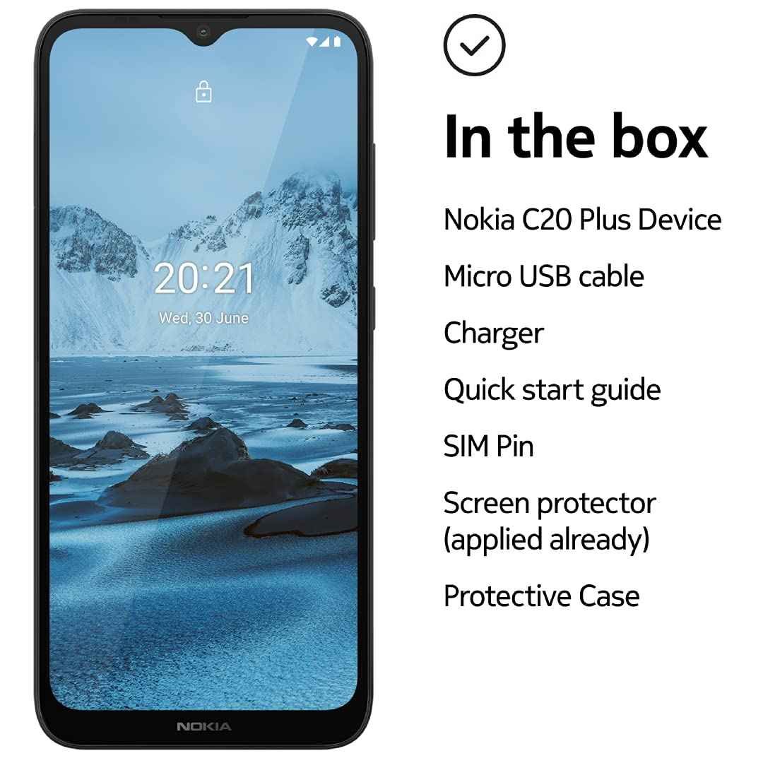 - Nokia C20 Plus Device, Charger, USB Cable, Headset (Optional), Quick Start Guide, Protective Case