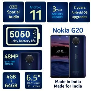 | Whats in the box | Nokia G20 Device, Type-C USB cable, Charger, Quick start guide, SIM Pin, Screen protector (applied already), Protective case |