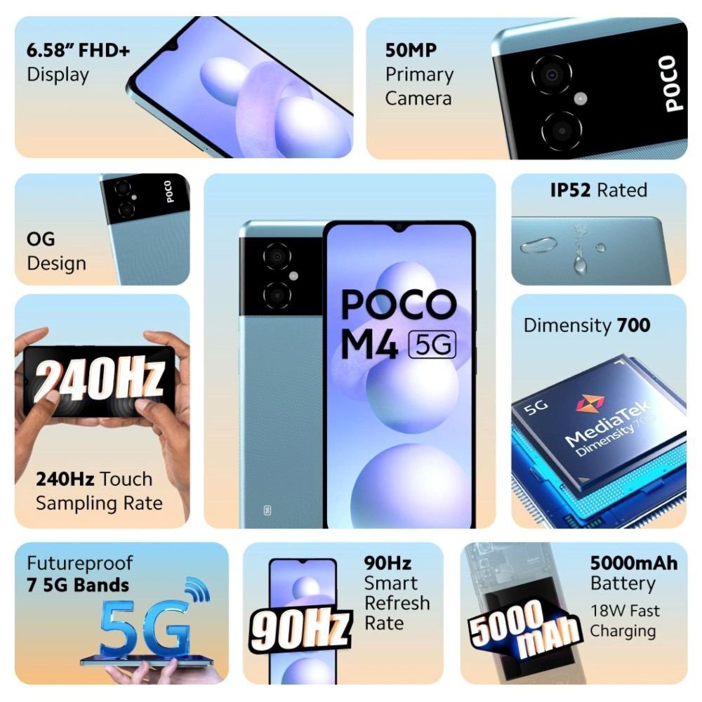 The POCO M4 5G features a 16.71 cm (6.58) Smart display with a 90 Hz refresh rate and a 240 Hz touch sampling rate. While gaming, browsing, streaming, and other activities, the display gives an incredibly fluid visual effect. Moreover, to provide optimal battery life, the smart display changes between refresh rates based on usage.