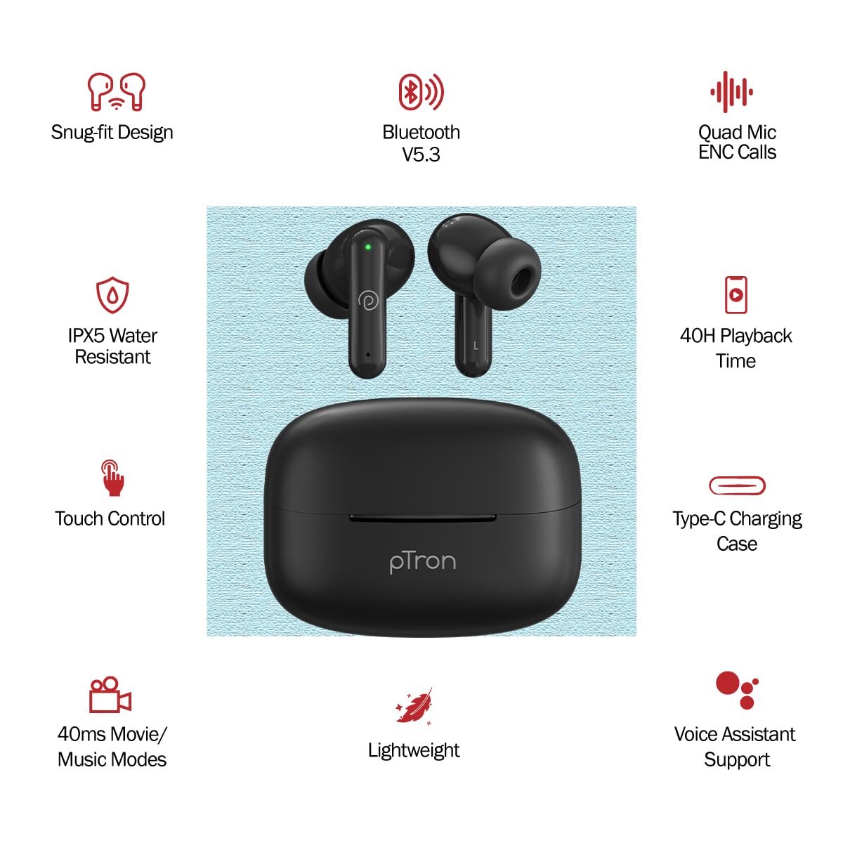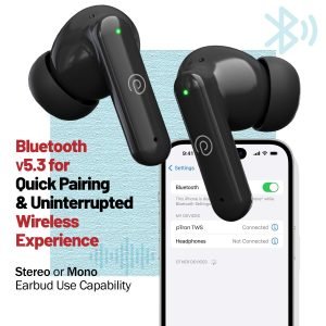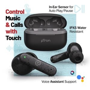 Introducing pTron Zenbuds X1 wireless earbuds, equipped with the latest Bluetooth v5.3 technology for super quick pairing, stable wireless connectivity, and wide compatibility with smartphones, tablets, and laptops. Immerse yourself in a natural sound experience with deep bass, thanks to the 13mm Dynamic drivers that deliver exceptional audio quality. Enjoy crystal-clear stereo call quality with 2 HD Mics in each earbud, enhanced further by TruTalk AI-ENC, filtering out background noises for unparalleled voice clarity. With an impressive 40 hours of playback time and a convenient charging case, these earbuds ensure you stay connected throughout your day. Elevate your mobile entertainment experience with Movie and music Modes, and effortlessly manage your music and calls with touch controls and the Auto Play/Pause In-Ear Sensor. The lightweight and secure-fit design, coupled with Passive Noise Cancellation, provides comfort and immersion, while Voice Assistant Support and Integrated Music/Call Controls offer added convenience. With an IPX5 water-resistant rating, Type-C Fast Charging Case, and Digital Display Case, these earbuds are the epitome of innovation, delivering a seamless blend of technology and style. 1-year manufacturer warranty on manufacturing defects only from the date of purchase | customer care contact details 040-67138888/support@ptron.in