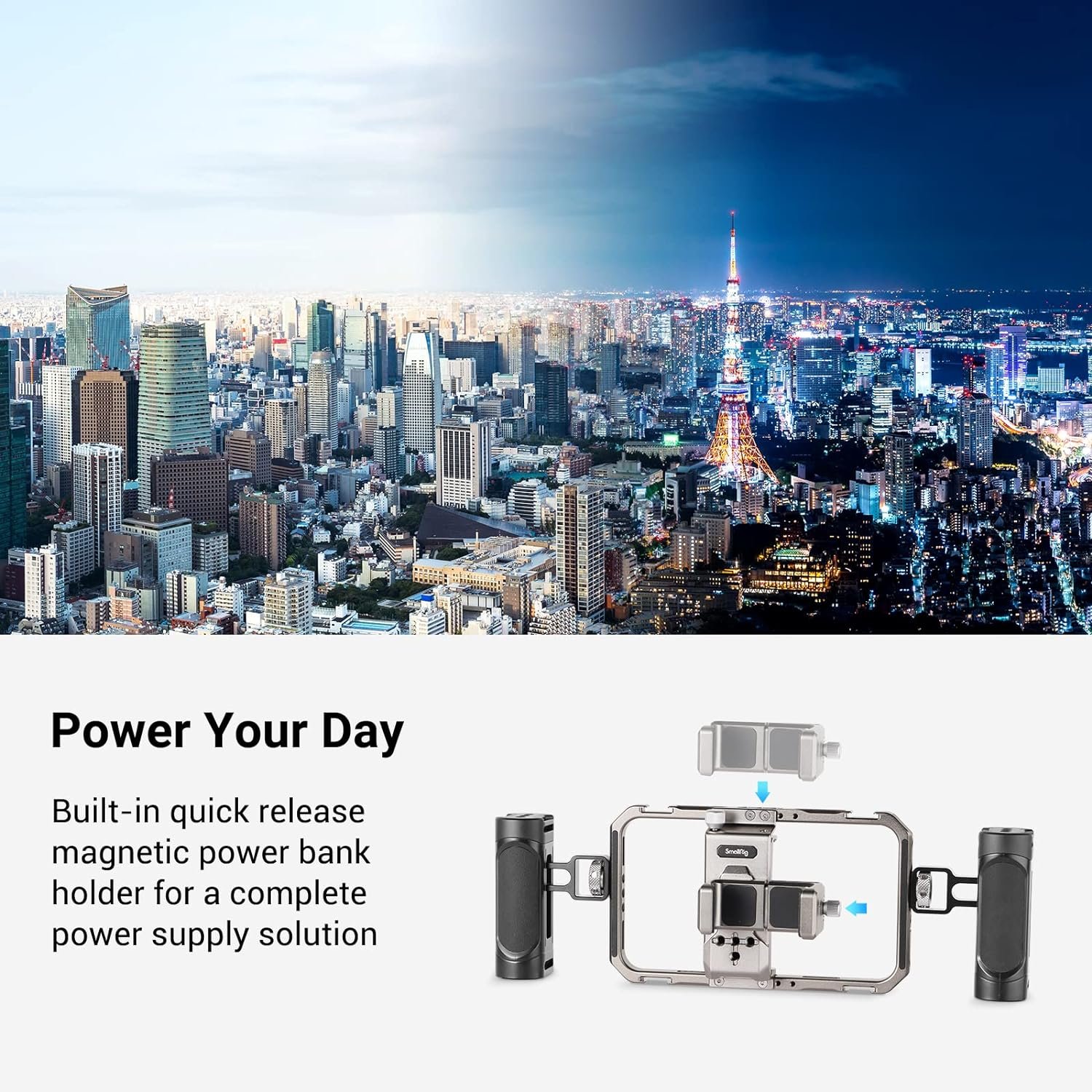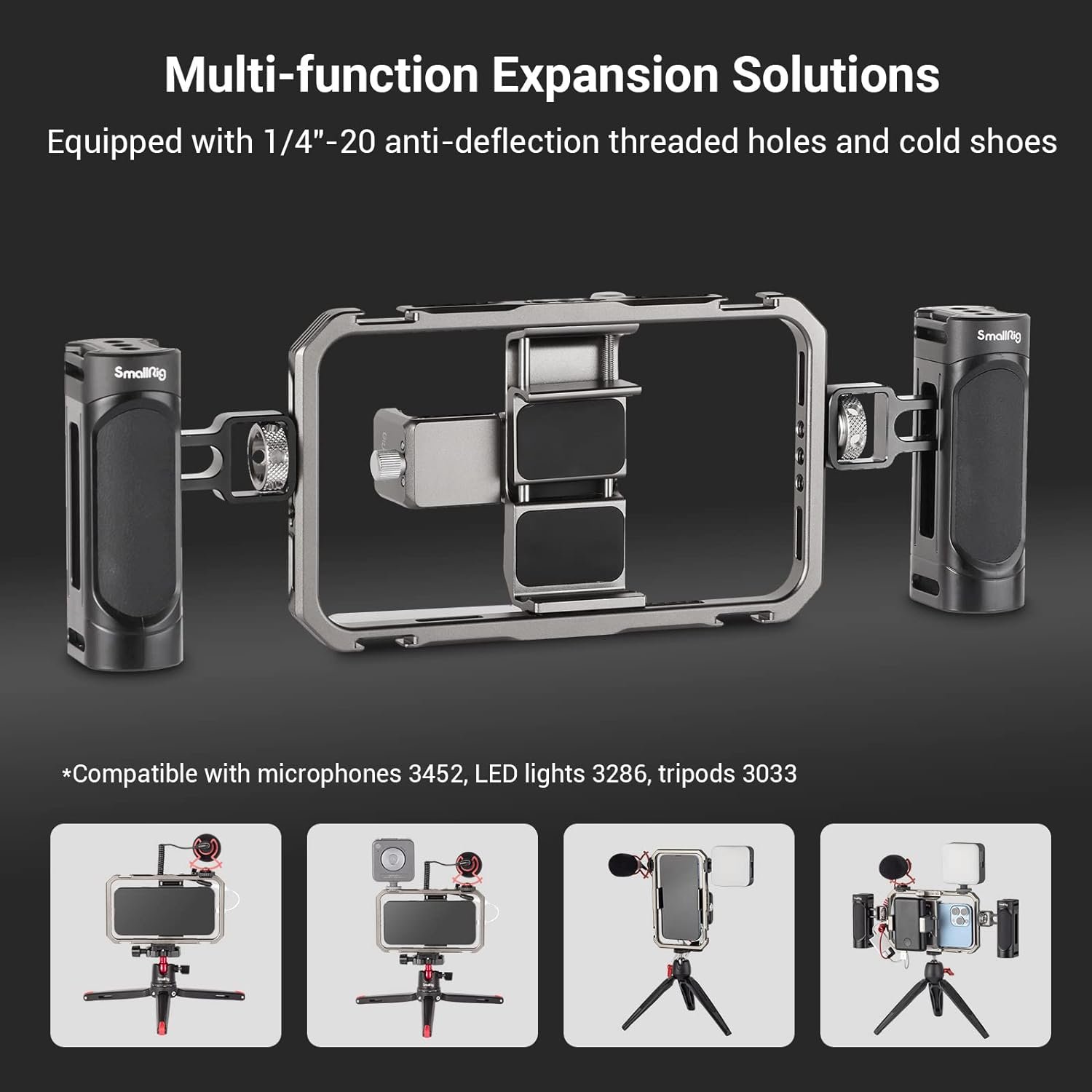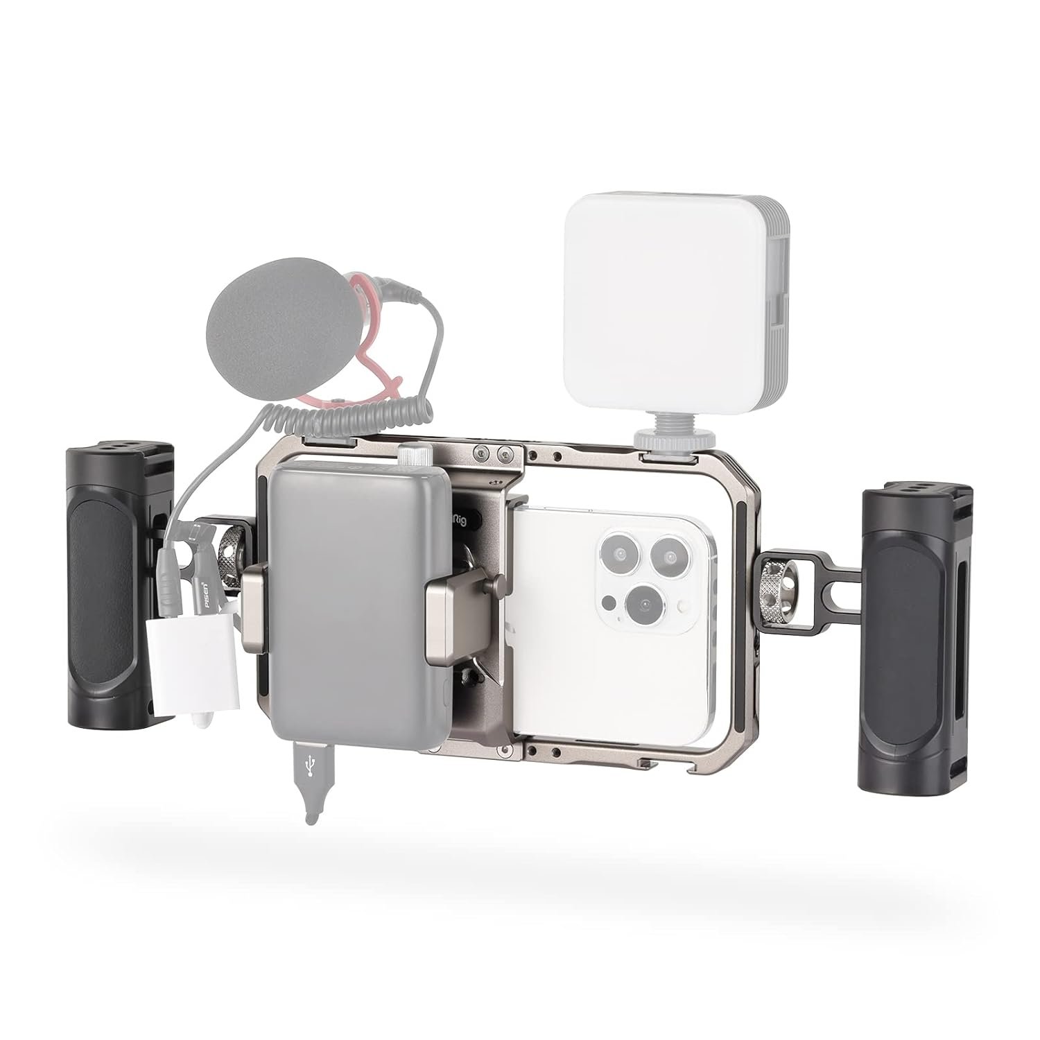 SmallRig Universal Video Kit for iPhone Series 3609 is a multifunctional and universal video kit for iPhone that helps upgraded videoing and vlogging experience. The video kit includes two side handles for more stable shooting; a built-in magnetic, anti-drop quick release power bank holder on the back for a complete power supply solution; and multiple 1/4″-20 anti-twist threaded holes and cold shoes for Tripod BUT2429, Microphone 3452 and LED Light 3286, etc. The phone holder can be adjusted left and right to give access to buttons and securely hold an iPhone with a case. It features built-in shims to increase stability and prevent scratches. The phone cage enables horizontal and vertical shooting.