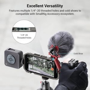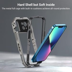 SmallRig handheld Kit for iPhone 13 3735 is a perfect mobile phone video rig for vlogging, mobile filmmaking, commercials, etc. The kit comes with a cage specially designed for iPhone 13 and a side handle for a more stable handheld phone shooting. The cage features 1/4″-20 anti-twist threaded holes and cold shoes that support accessories as Tripod BUT2429, Microphone 3452 and LED Light 3286, etc. It supports M-mount lens to upgraded the video quality. It gives access to iPhone buttons, ports, and ultra-wide angle lens thanks to its hollow design. The metal full cage with built-in shims prevents scratches, reduces vibration. The cage enables horizontal and vertical shooting.