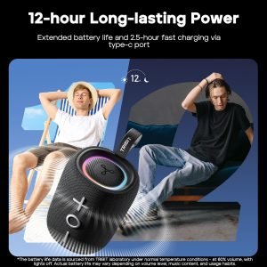 No battery anxiety with StormBox Mini’s powerful rechargeable battery, offering impressive 12 hours of continuous playback. Ideal for on-the-go adventures like travel, camping, and more.