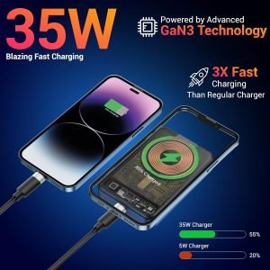 ULTRA FAST CHARGINGExperience Lightning-fast Charging Speeds. Our GaN Chargers Can Power Up Your Devices Up To 3 Times Faster Than Conventional Chargers. Get Back To What Matters Most Without The Wait. |
